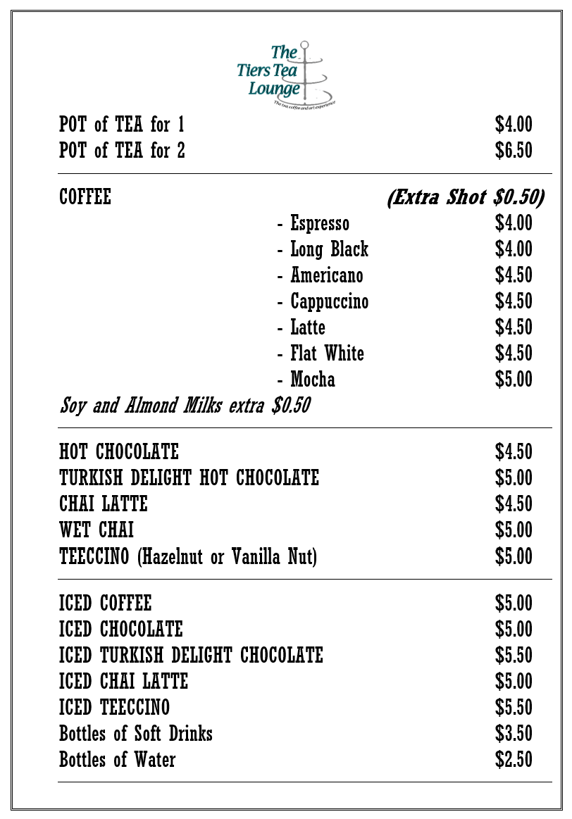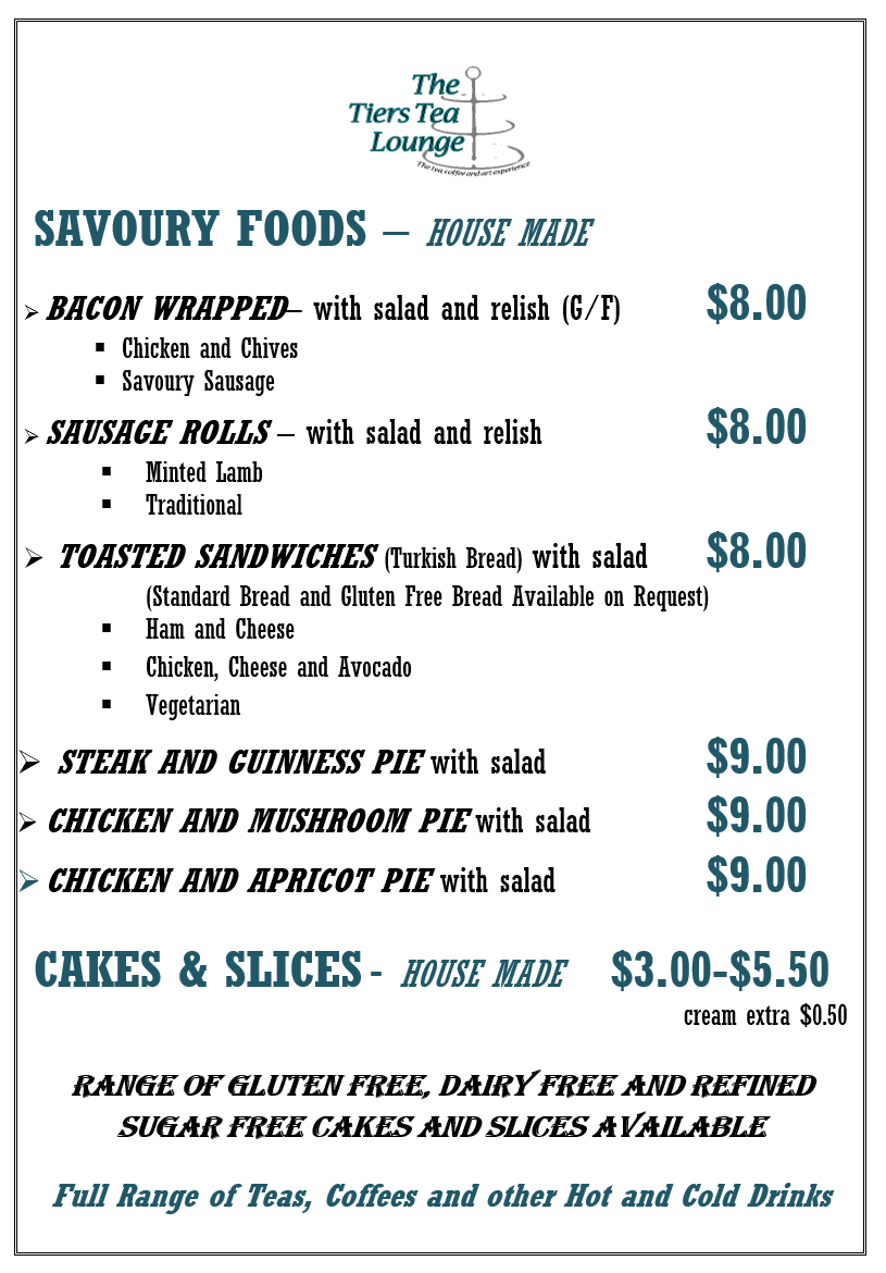Welcome to The Tiers Tea Lounge, a charming café nestled in the East Wing of The Village Green, Poatina. This delightful spot offers a menu that celebrates locally sourced ingredients, with a focus on handmade, gourmet options. Highlights include their flavorful Gourmet Sausage Rolls, available with traditional or minted lamb fillings, and Toasted Sandwiches featuring chicken and avocado, ham and cheese, or a hearty vegetarian option on Turkish or gluten-free bread, all for just A$8.00.